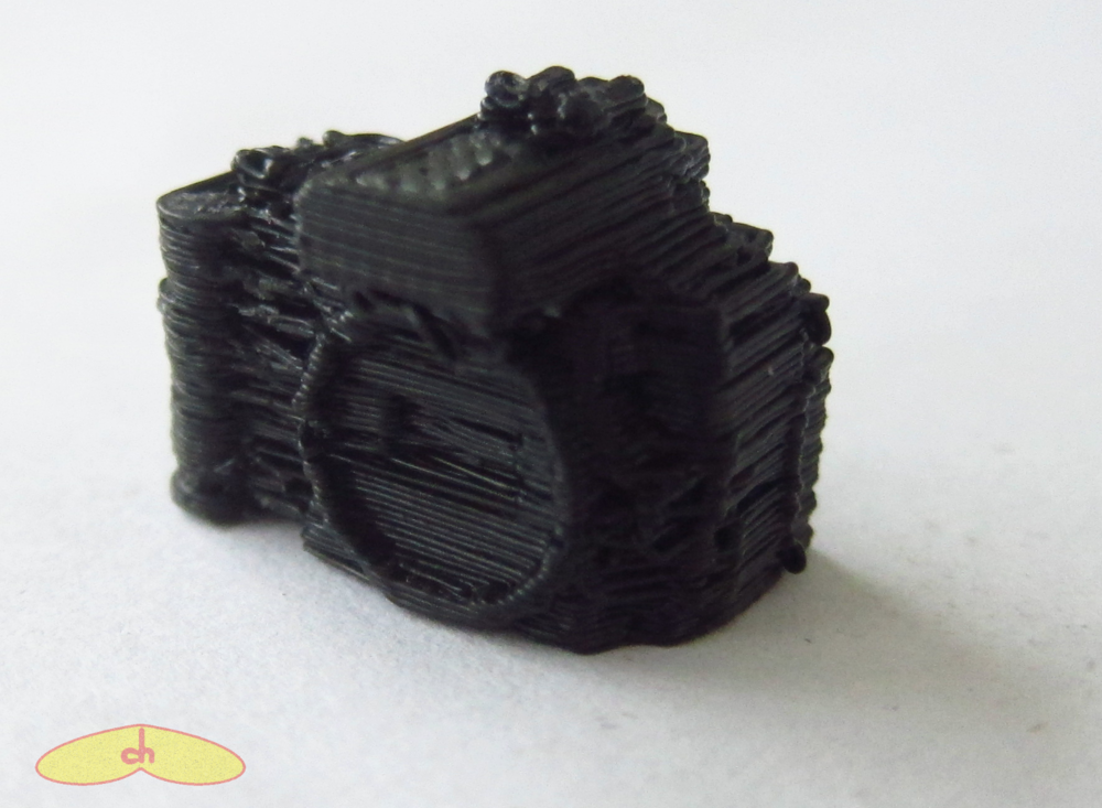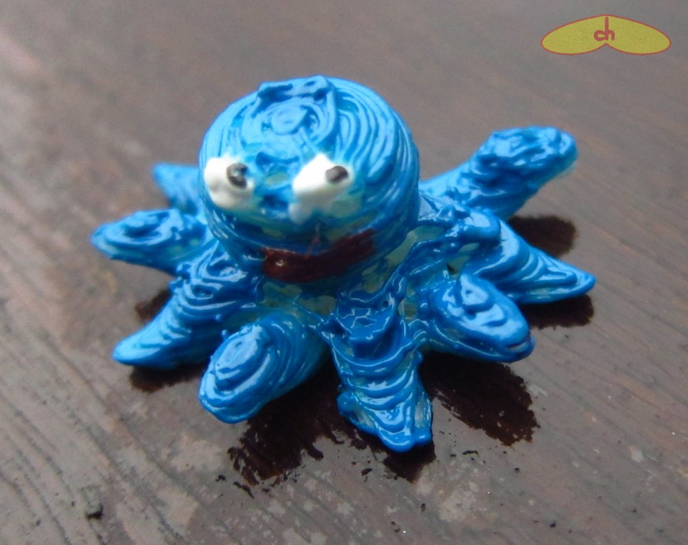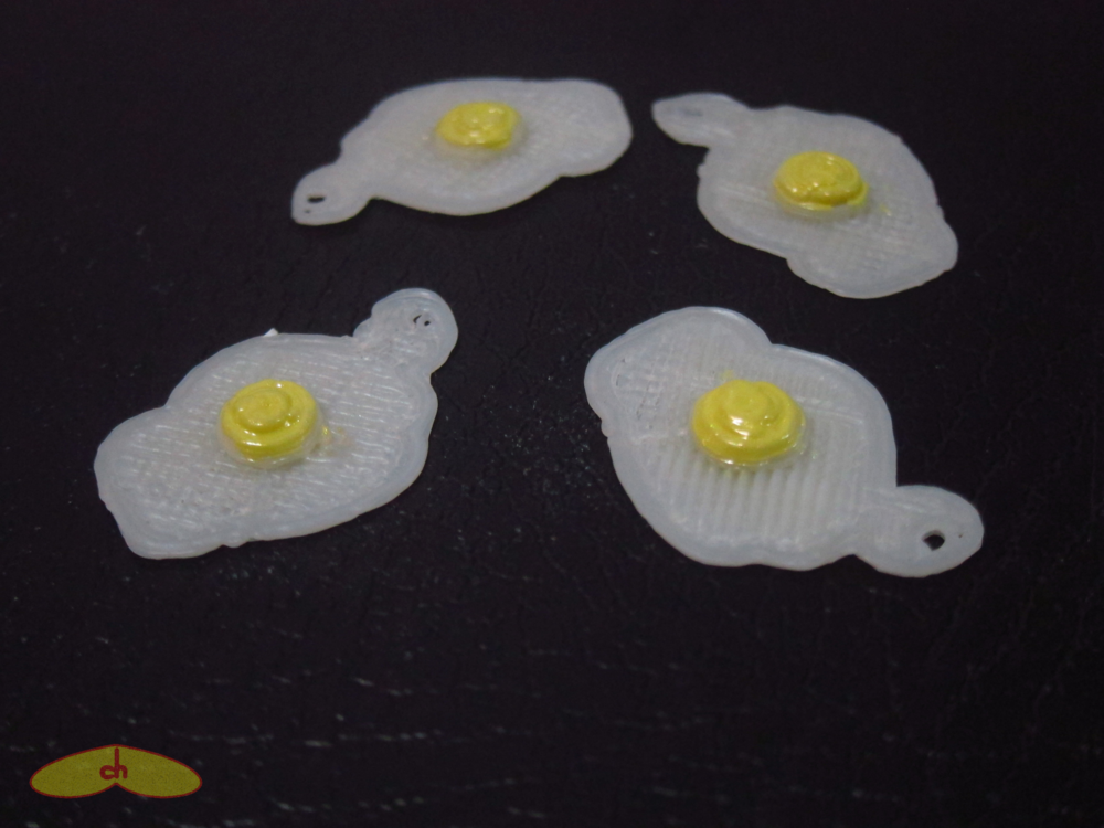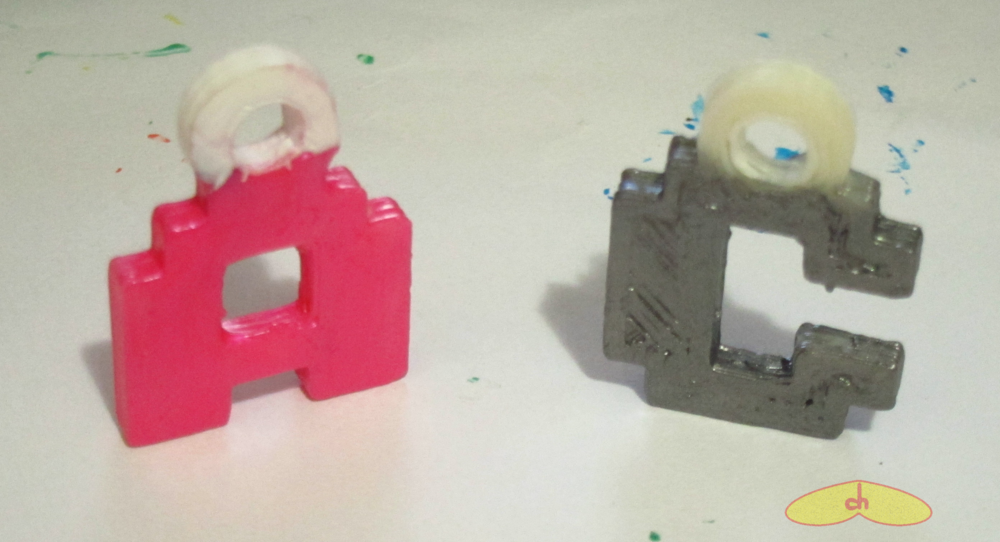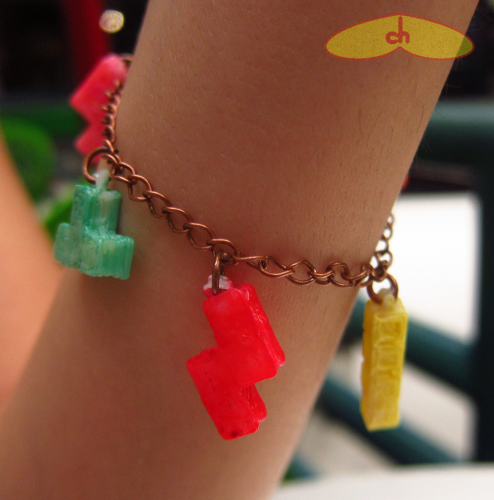 The eggs came out perfectly. The squid, the turtle, the gekko and the camera came out better than I expected, but not as well as Schorhr’s, and some came out without a ring to be hanged. Some of the tetris came out good, with the ring and all, but others didn’t – it seems to depend a lot on the piece’s position and the path the nozzle was doing before getting to the ring. Still, I was able to make a nice tetris bracelet. The traffic light came out bad and some of its parts broke, but it looks much better after painting. And the fish came out terrible hehehe I also tried printing his foosball table, the castle, the pinball, pac man, film stripe, earth core and spiked mace, all unsuccessfully. Maybe some of them could be printed in a bigger size or using support, but I haven’t tried that.