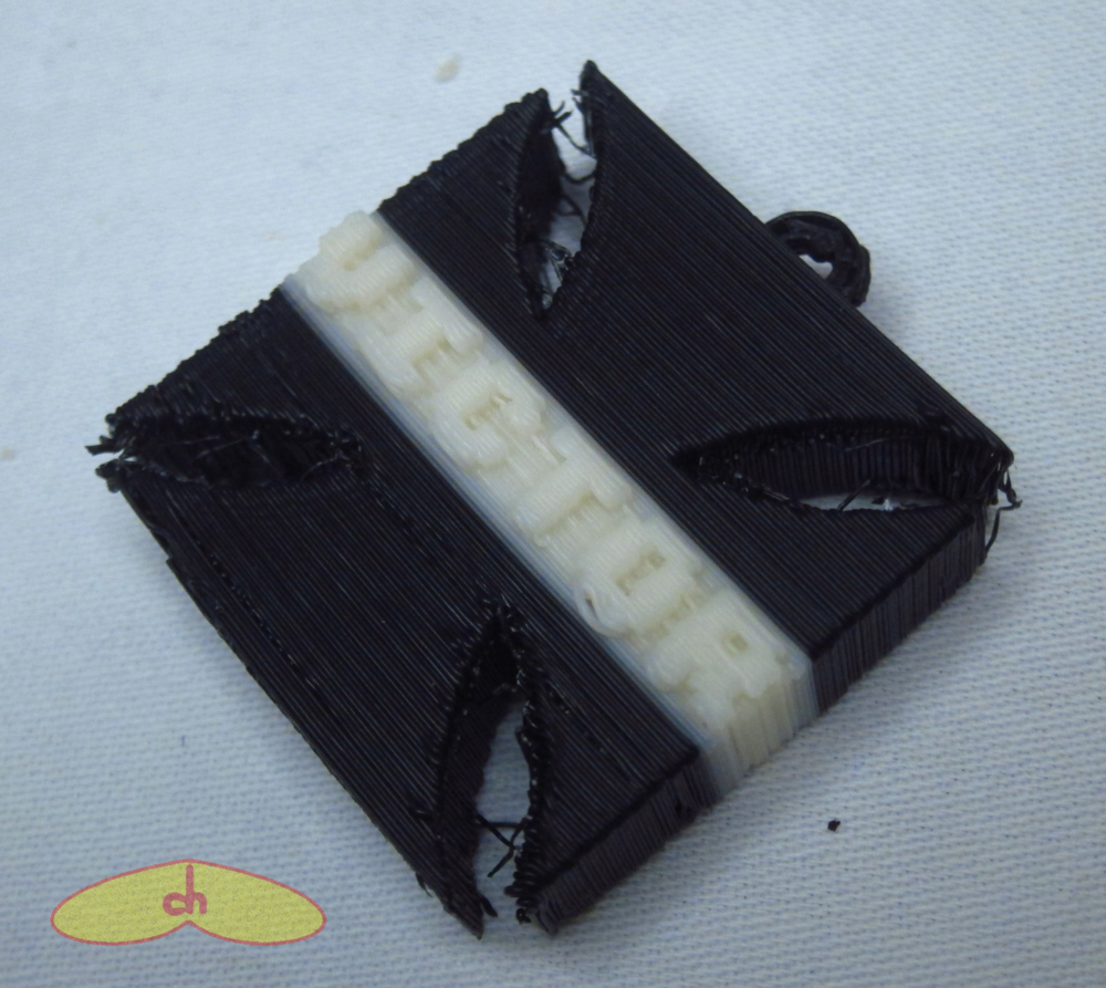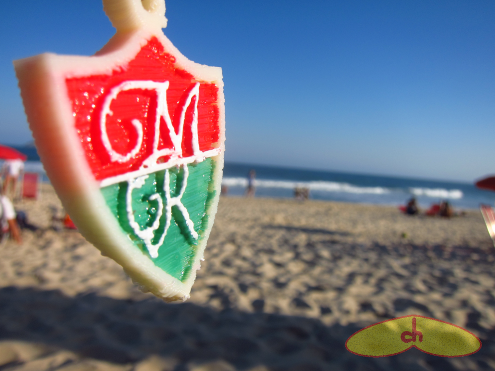 And finally, I’ve made a few personalized keychains with Brazilian football club symbols. I designed a “cruz de malta”, symbol of the Vasco da Gama club with my friend’s name on it, and the crest of the Fluminense club with my friend’s initials instead of the original ones. When printing details such as letters on flat surfaces, I’ve noticed it comes out better if the letters are on the side of the print instead of on top, so they are part of the object’s outline. This results in better resolution and less ooze (strings), because when on top the nozzle, at least for me, moves too fast and the details get messy. So I’ve printed both vertically (the MR had a small support which I cut off). The Victor one was the first time I changed plastic mid-print to make an object in many colors.