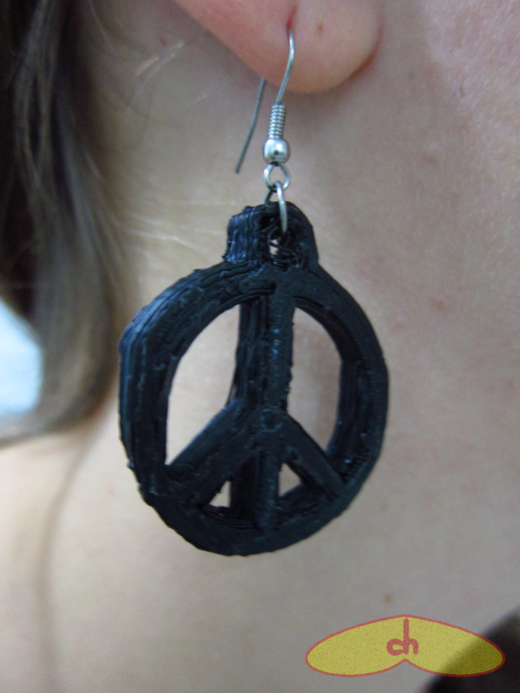 One of the first things I printed out with my 3D printer was an earring. Back then my printer had some wrong settings and the printing dimensions came out wrong. That didn’t stop me from wearing the ring that night though, I was proud of my first print which looked like something. This is how my peace earring looks like: