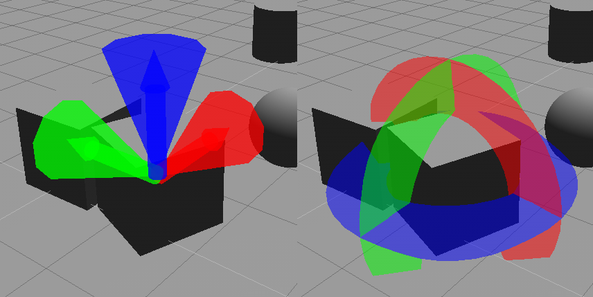 - Translation and rotation modes accessible by radial menu or header buttons, which are synced