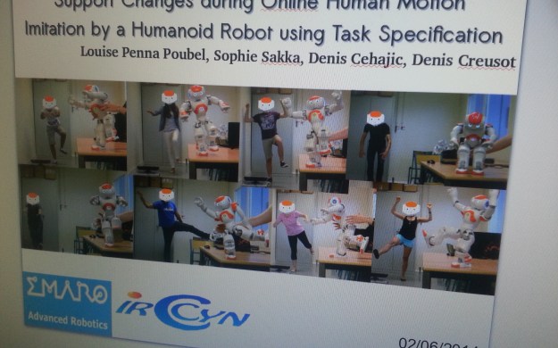 It’s a long title but what was done was pretty simple: someone moves in front of a Kinect sensor and the robot imitates the movement in real time. Very slow movements, but the robot is able to take feet off the floor, stand on one leg and so on. The paper is summarized on this video: