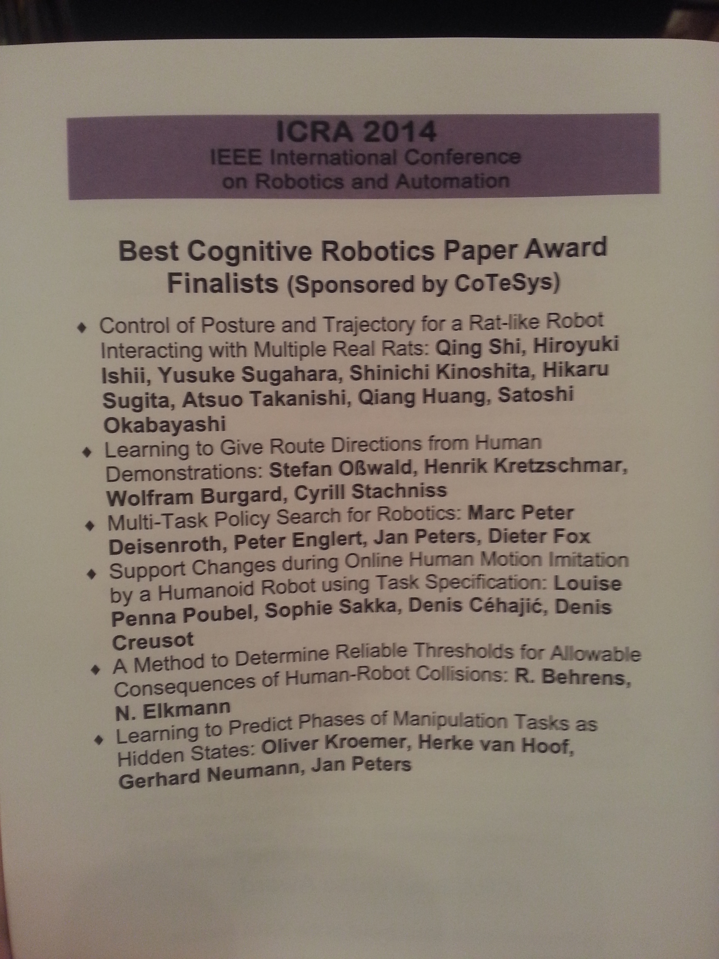 To my surprise, the paper was a finalist for the Best Cognitive Robotics Paper Awards, and consequently for the Best Paper Awards! Didn’t win, but it for sure was great to be a finalist!